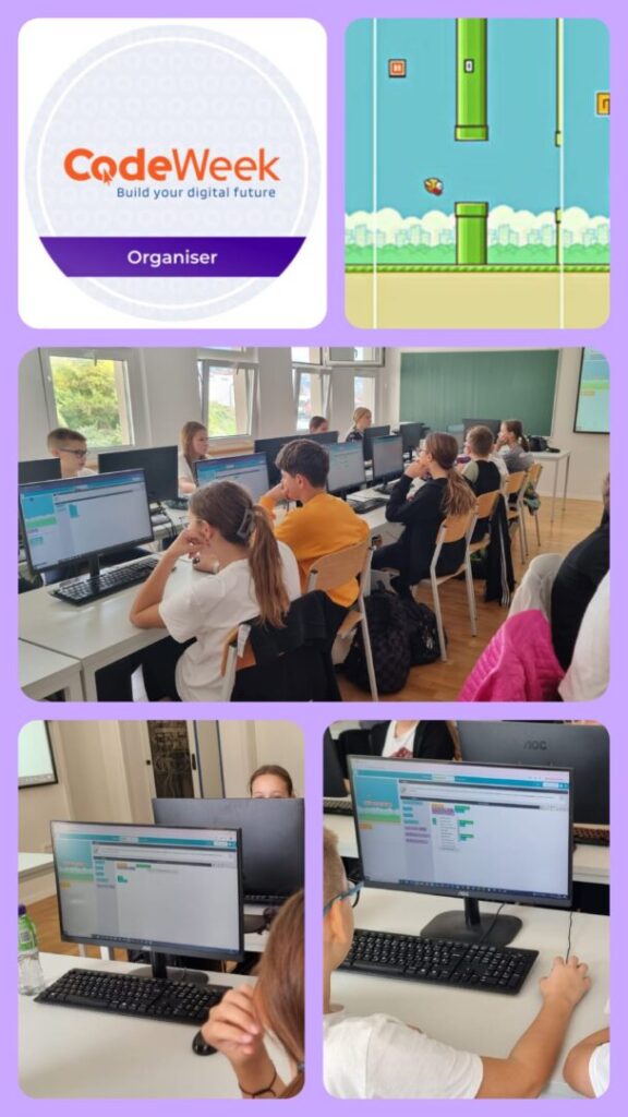 „Postani Flappy programer“ je zabavna i kreativna aktivnost kojom su učenici 5.a, 6.b i 6.c razreda, uz mentorstvo Marine Perice, koristili platformu Code.org i njezino vizualno programiranje temeljeno na blokovima kako bi izradili vlastitu verziju popularne igre Flappy Bird. Korak po korak programirali su ponašanje svog lika – od njegove reakcije na klik ili dodir, do načina kretanja kroz prepreke i sustava prikupljanja bodova. Poseban naglasak bio je na kreativnosti: učenici su mijenjali izgled i temu igre, stvarajući jedinstvene verzije .Na taj su način kombinirali programiranje s vizualnim dizajnom, učeći kako prilagoditi elemente igre vlastitim idejama. Tijekom aktivnosti razvijali su logičko i računalno razmišljanje, učili kako riješiti pogreške u kodu i samostalno donositi odluke.