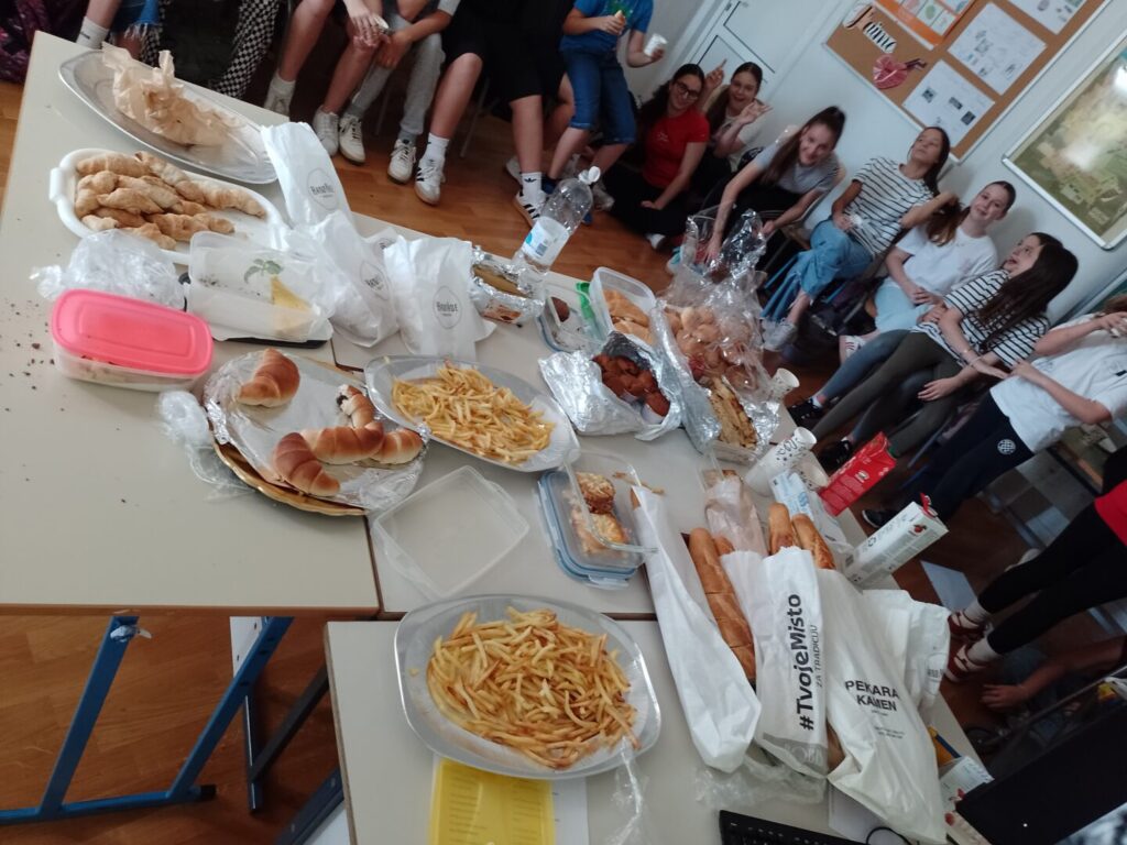 Uz podršku naše drage lektorice Lée Falaize, uživali smo u kvizovima, smijehu i dobroj glazbi uključujući i poznatu pjesmu “La vie en rose” slavne francuske pjevačice Édith Piaf. Svi smo sa sobom donijeli razne delicije koje smo ponosno predstavljali: croque-monsieur, les frites, jambon, baguettes, jus de fruit, croissants, crêpes, macarons, bisquit petit beurre i još mnogo drugih slanih i slatkih užitaka.