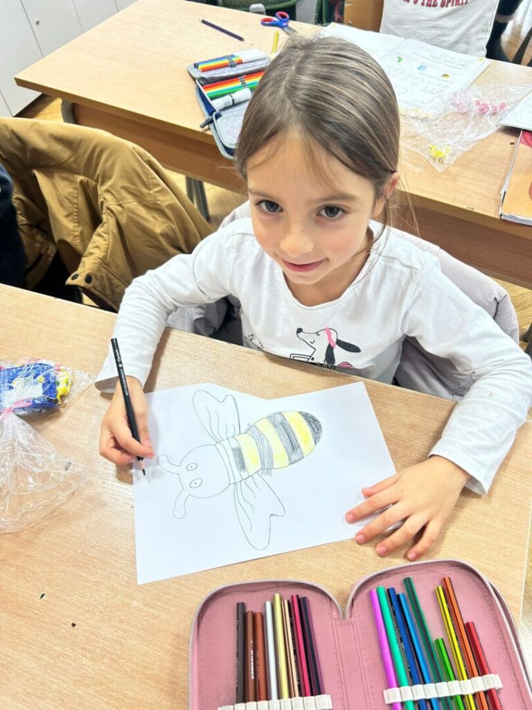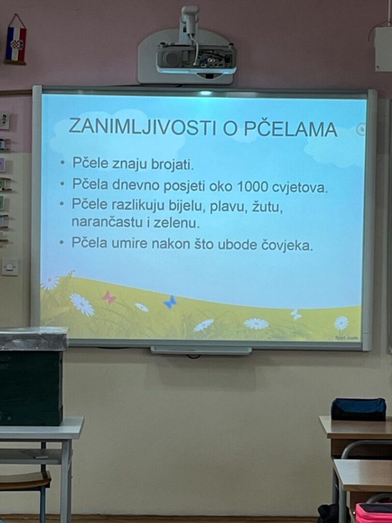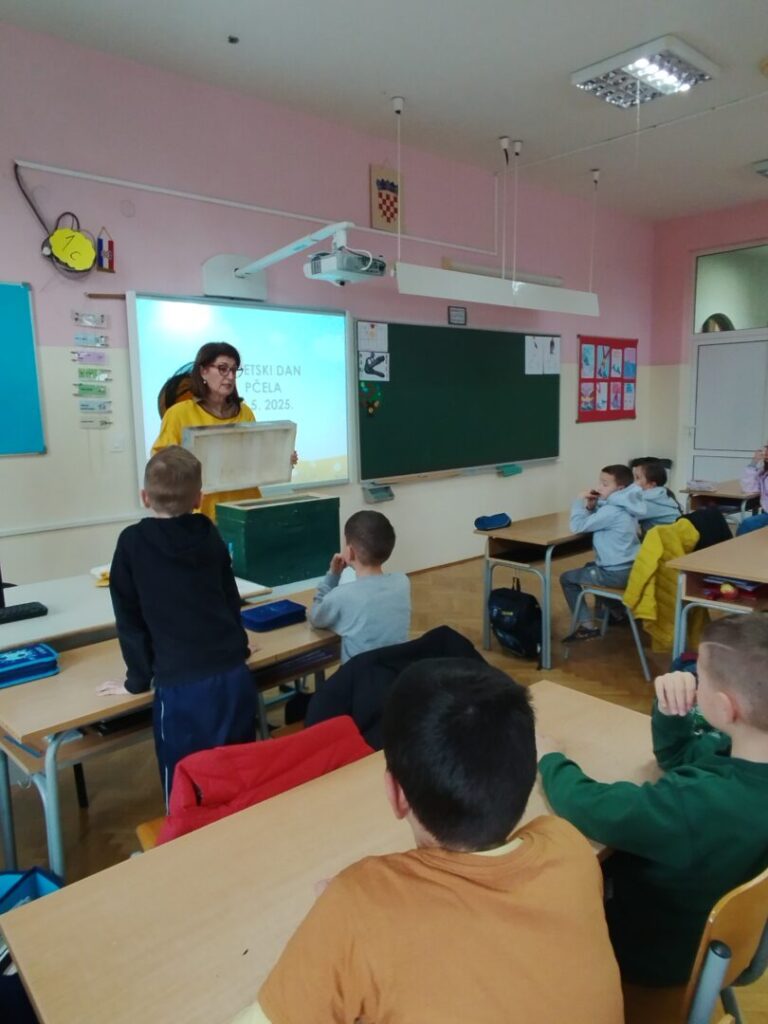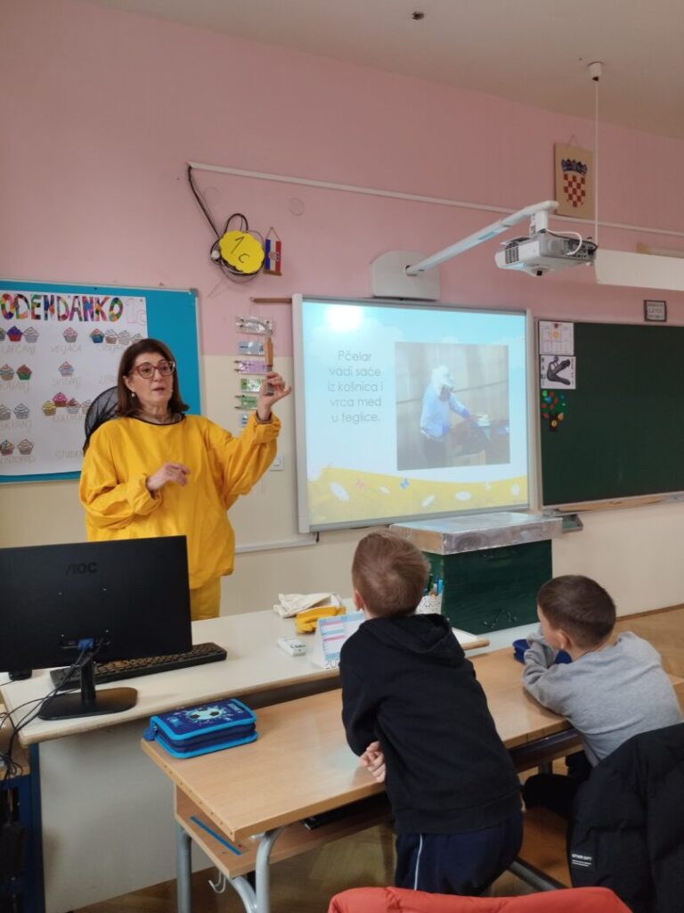 Budući da se i sama bavi pčelarstvom, nastavnica Irena došla je u pčelarskoj opremi, što je posebno razveselilo učenike. Djeci je pokazala košnicu te im objasnila zašto se košnice boje i u koje se boje bojaju. Pokazala im je i pribor za vrcanje meda te uzorak saća s medom pa je cijelo predavanje bilo interaktivno i dojmljivo.
