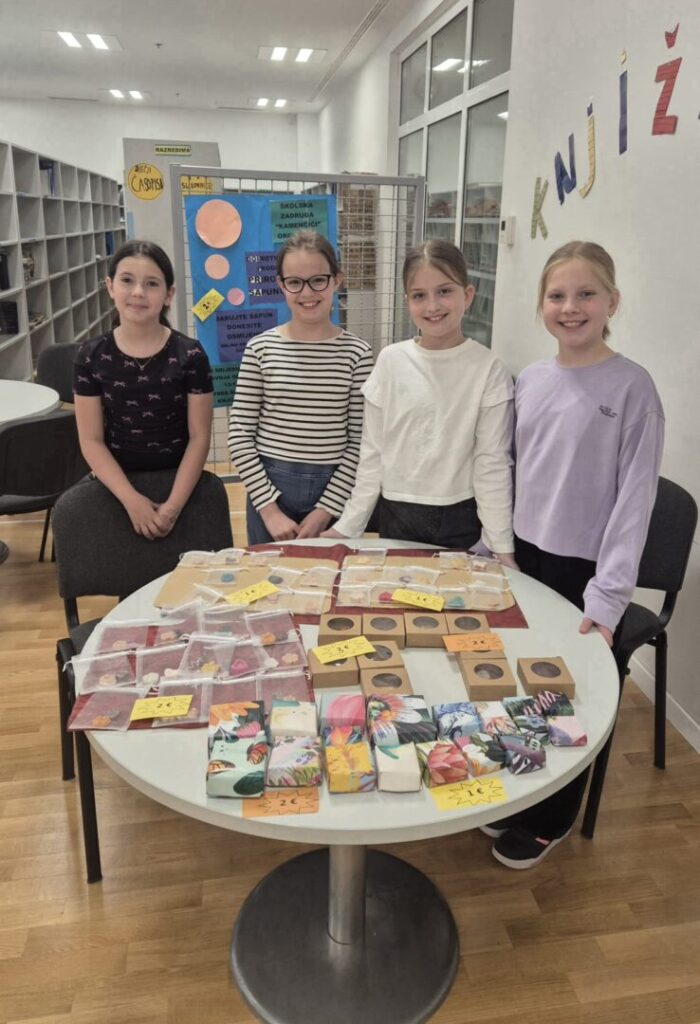 Ispred školske knjižnice naši učenici zadrugari i mali knjižničari, uz podršku knjižničarke Marije Lončar i nastavnice Meri Juras, organizirali su prodajni štand na kojem su s ponosom izlagali i prodavali ručno izrađene prirodne sapune.