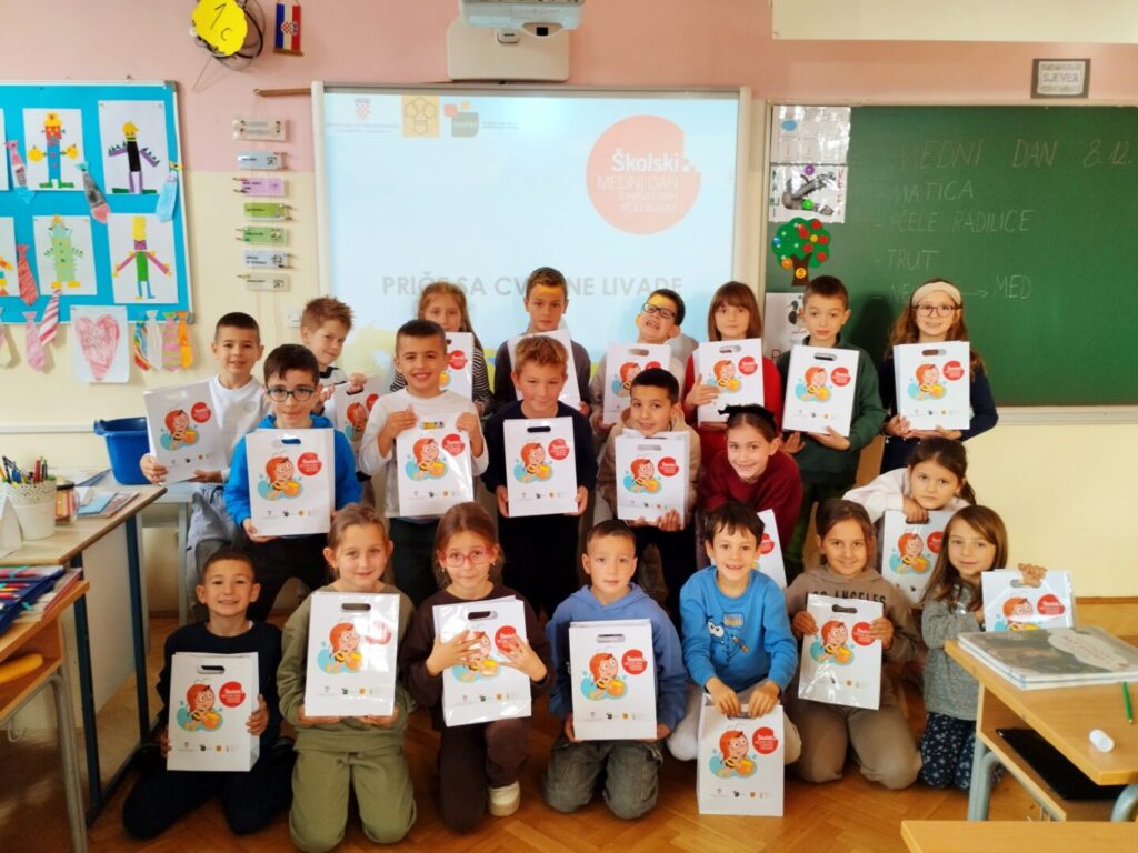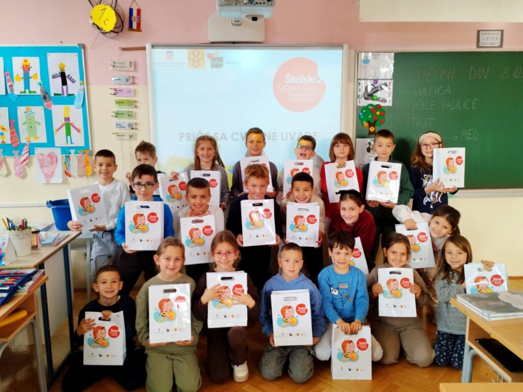 Na kraju, svaki je učenik dobio prigodan poklon – staklenku domaćeg meda i slikovnicu o pčelici Jelici.