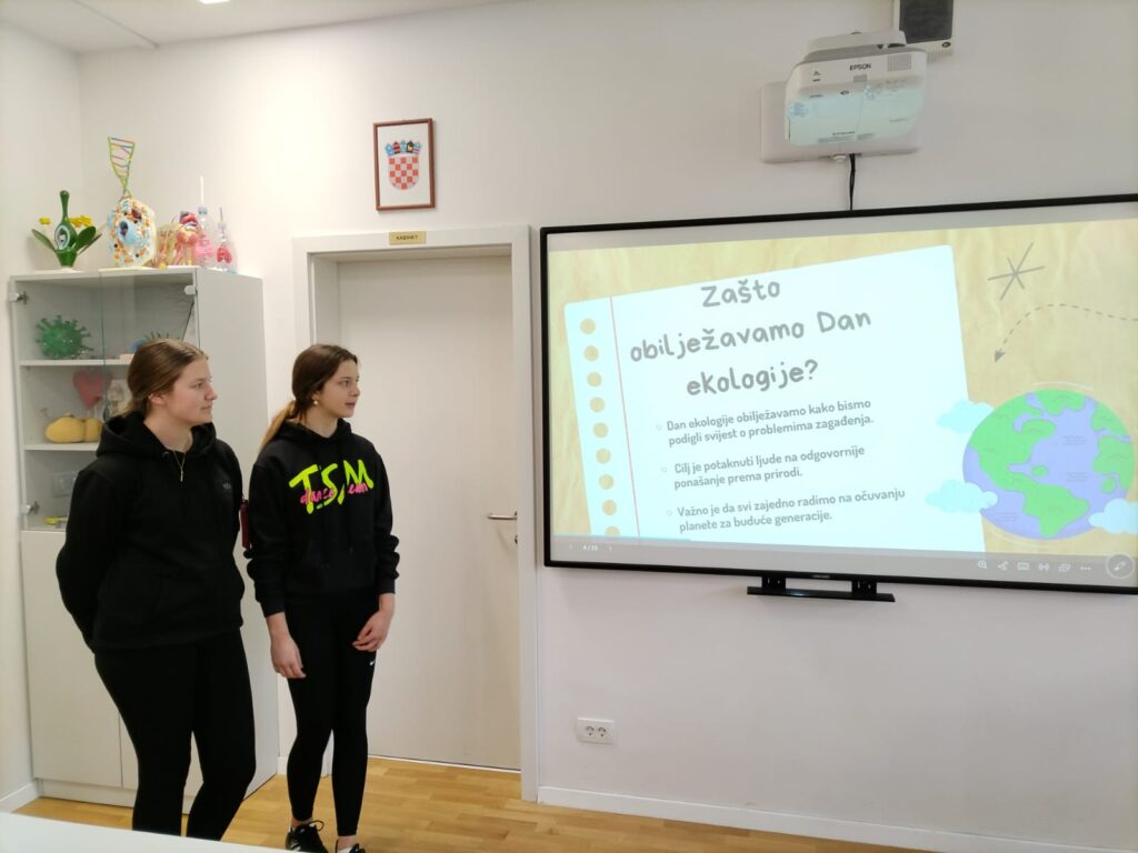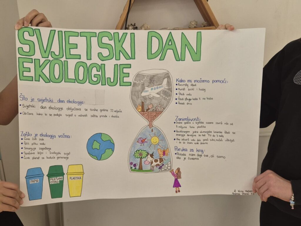 Sat je započeo zanimljivom prezentacijom i plakatom, koji su nas podsjetili na važnost brige o okolišu te na male, ali važne korake koje svatko od nas može poduzeti kako bi doprinio očuvanju planeta. Posebnu pažnju privukao je model morskog konjića izrađen u potpunosti od recikliranog otpada, kojim su učenici na kreativan način istaknuli važnost zaštite okoliša.